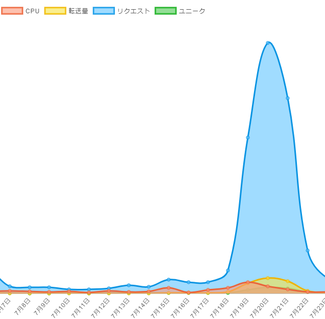 バズり期間中のサーバーの性能情報ですが、真っ最中のリクエスト量はぶっ飛んでいますが、