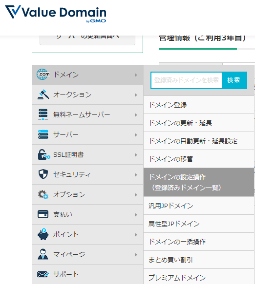 ここは現在利用しているドメイン屋さんで、だいぶ画面が異なるともいますがValue-Domainだとこのような感じです。